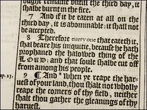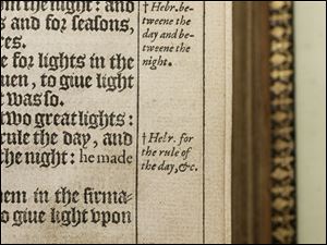 Detail shot of one of two 400-year-old first edition King James Bibles that will be going on display at at the Toledo Museum of Art. This shows text that translators inserted in their own words, in Roman type face, as opposed to words "directly from God" in Gothic type.