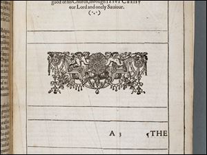 Detail shot of one of two 400-year-old first edition King James Bibles that will be going on display at at the Toledo Museum of Art. This shows "thistle and rose" pattern.
