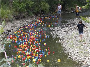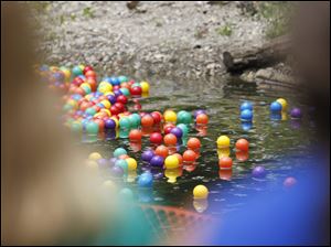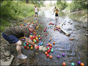 Steve DeMascio, of Sylvania, helps move balls down the creek .