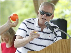 Eddie Boggs, of Sylvania, reads off another winner during the annual River Ball Race.
