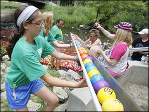 Plastic balls were tossed in Ten Mile Creek and then floated down the creek into a staging area, with the first 84 balls garnering prizes for participants.
