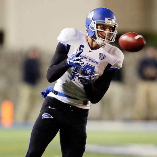 Buffalo WR Alex Neutz (19) makes a catch against the University of Toledo during the first quarter.