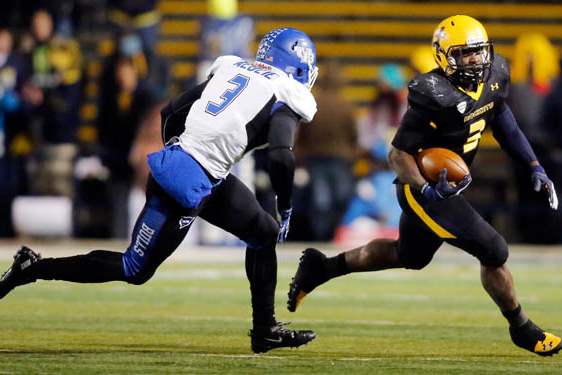 University of Toledo RB Kareem Hunt (3) runs the ball against Buffalo OLB Khalil Mack (46) during the first quarter.