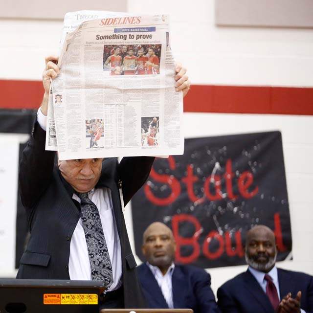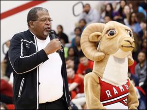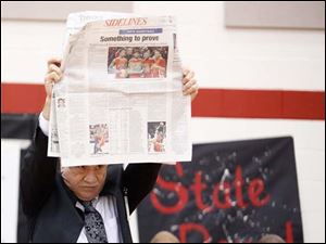 TPS superintendent Jerome Pecko holds up a copy of The Blade during a pep rally Thursday at Rogers High School. The Rams' boys basketball team will play in the Division I state semifinals Friday in Columbus.