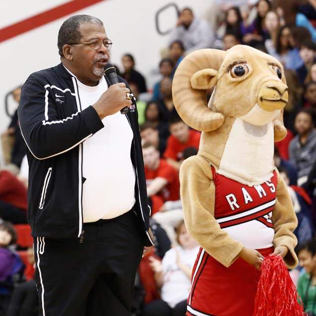 Rogers head coach Earl Morris speaks about the boys basketball team as the Rams mascot stands by.