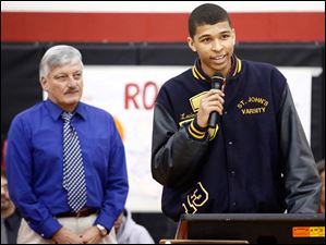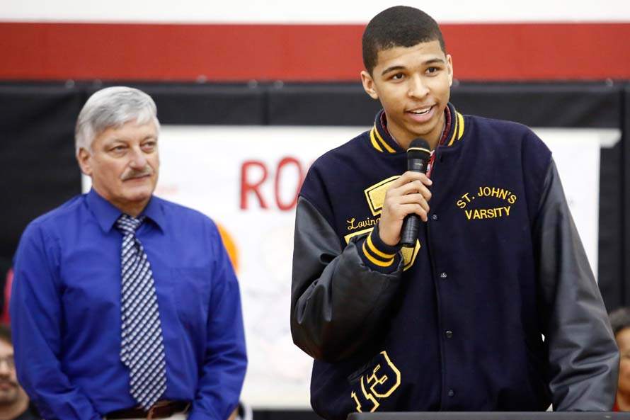 St. Johns' basketball player Marc Loving and head coach Ed Heintschel speak during a pep rally for the Rogers Rams as they head to the state semifinals.