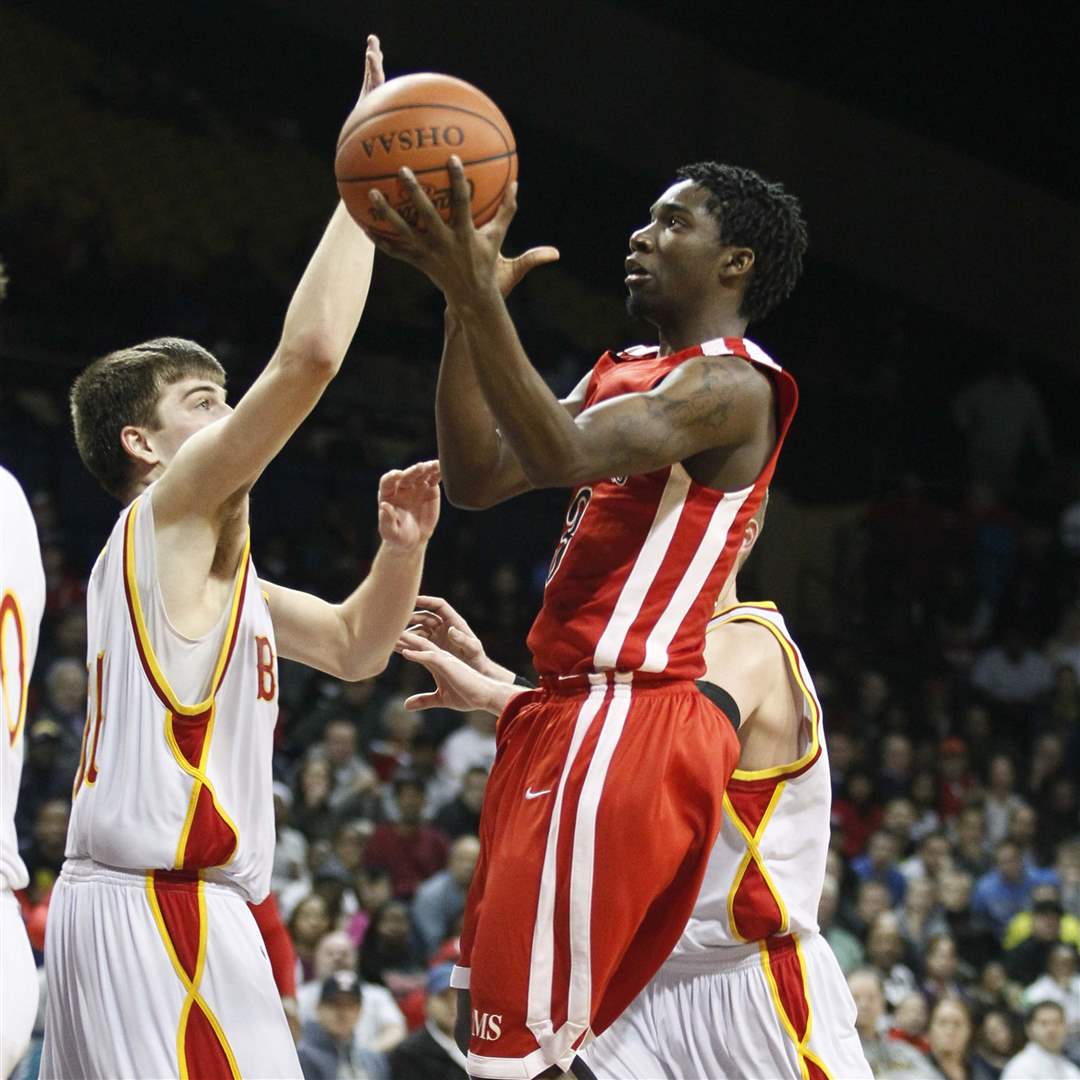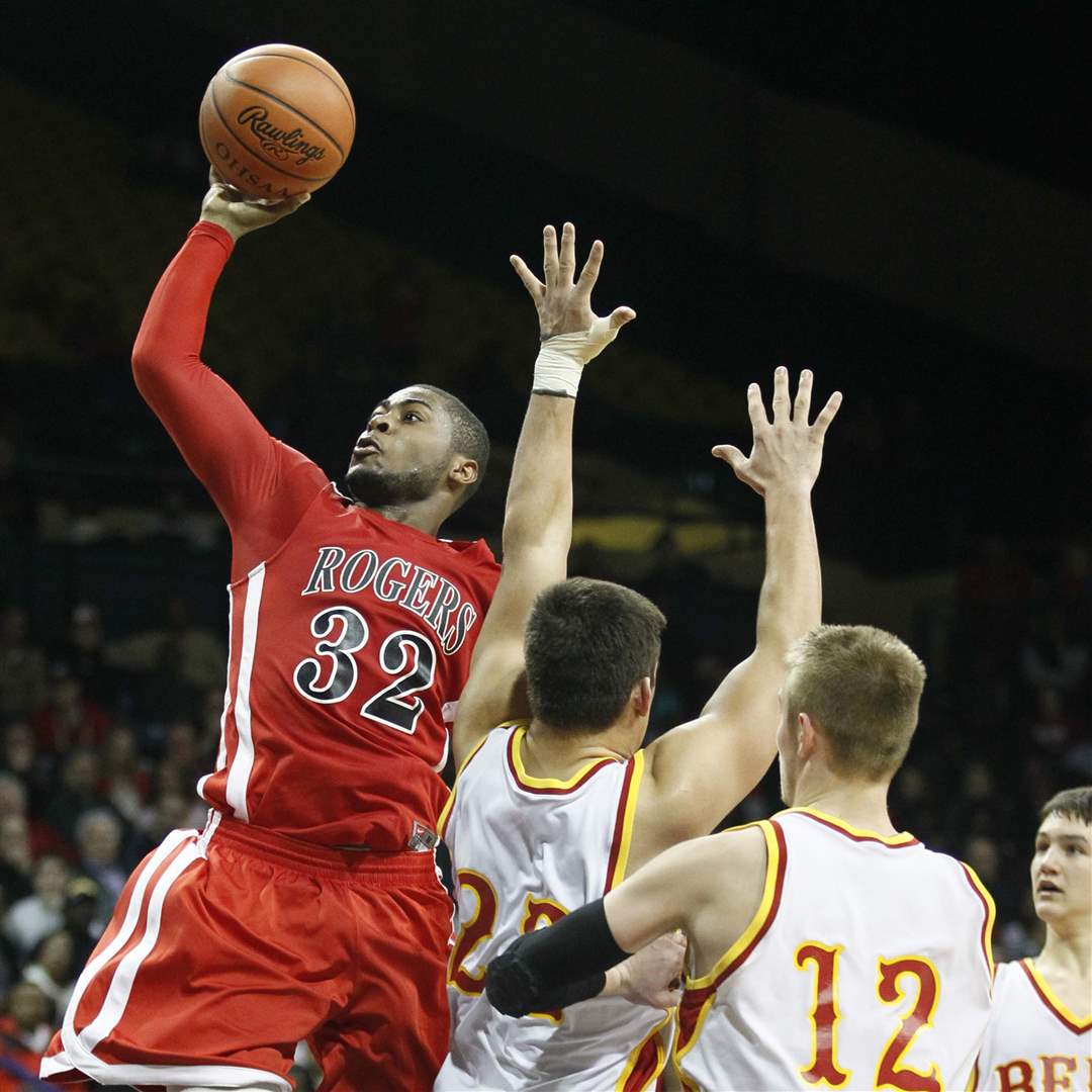 Rogers' DeVonte Pratt (32) goes to the net against Brecksville-Broadville Heights' Mike Tyler (22).