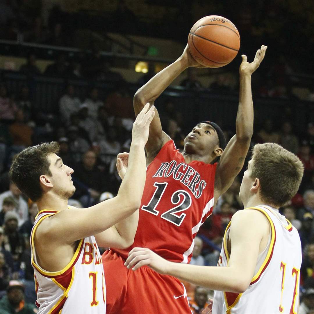 Rogers' Clemmye Owens takes a shot as he is guarded by Brecksville-Broadville Heights' Tommy Tupa (10) and Mark Chrzanowski (11).