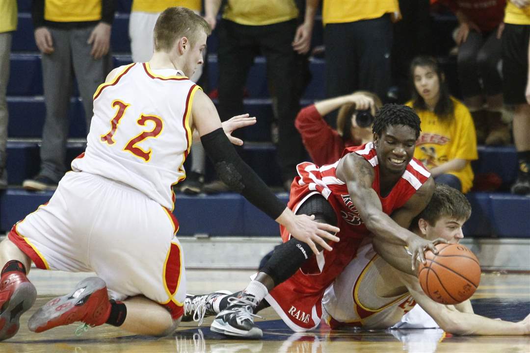 Rogers' Tony Kynard II (3) battles Brecksville-Broadville Heights' Mark Chrzanowski (11) and Matt Csuhran (12) for a loose ball.
