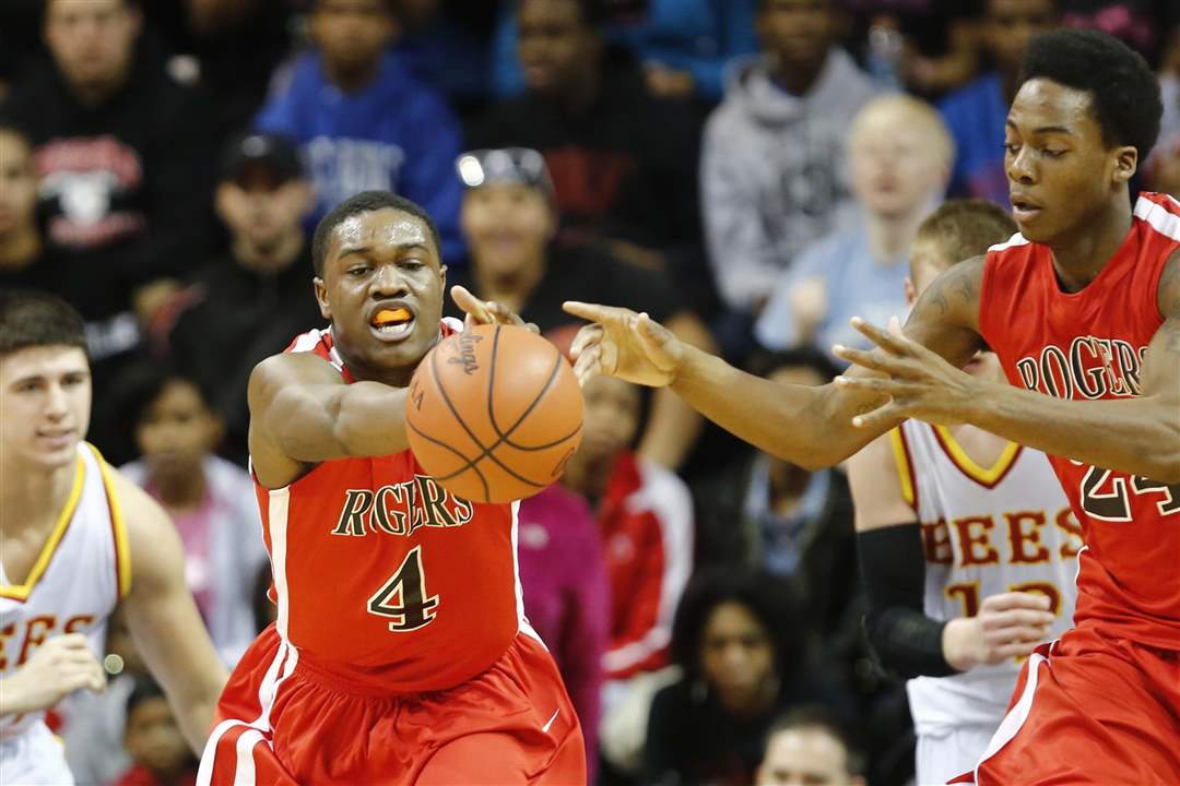 Rogers's Keandre Gilmer (4) and Tribune Dailey Jr. (24) steal the ball from Brecksville-Broadville Heights.
