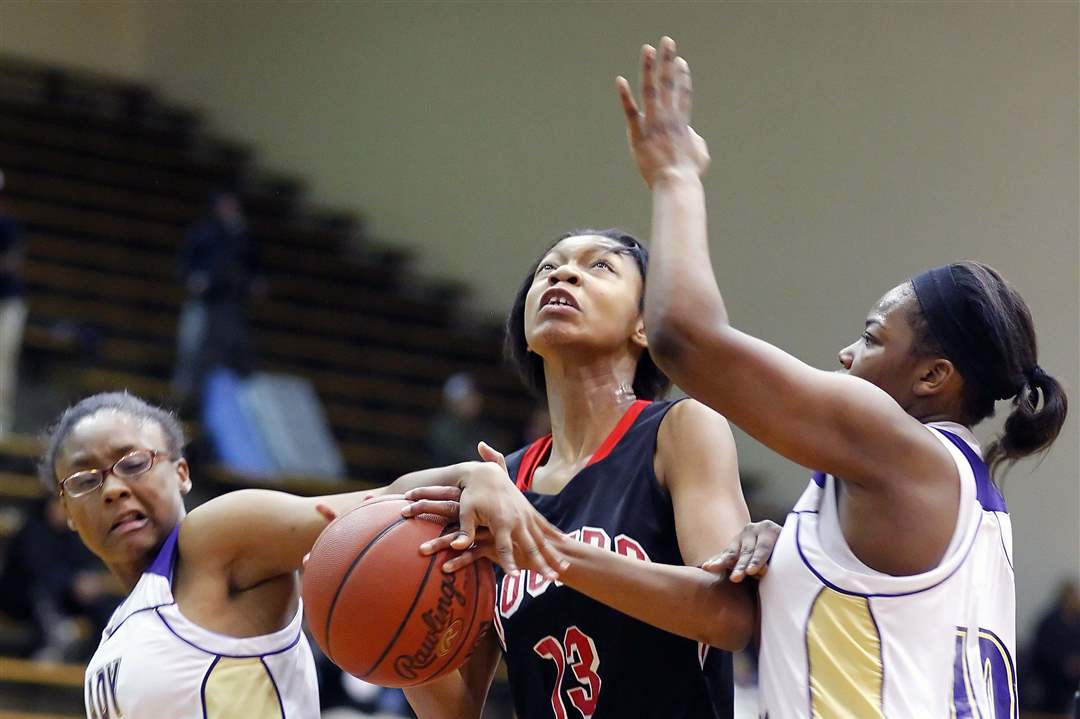 Rogers' Toriana Easley (13) goes to the net against Waite's Kayla May (4) and Ramiah Henry (10).