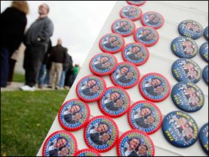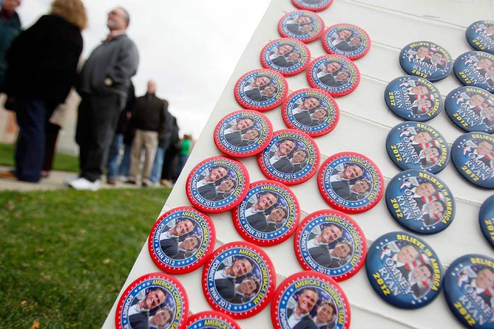 Campaign buttons for sale outside of the University of Findlay Koehler Athletic Complex while the crowd lines up to see Mitt Romney and Paul Ryan during the 'Victory In Ohio' Bus Tour on October 28, 2012.