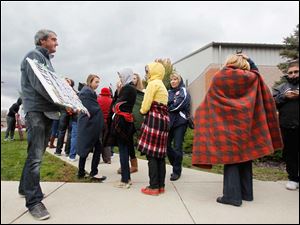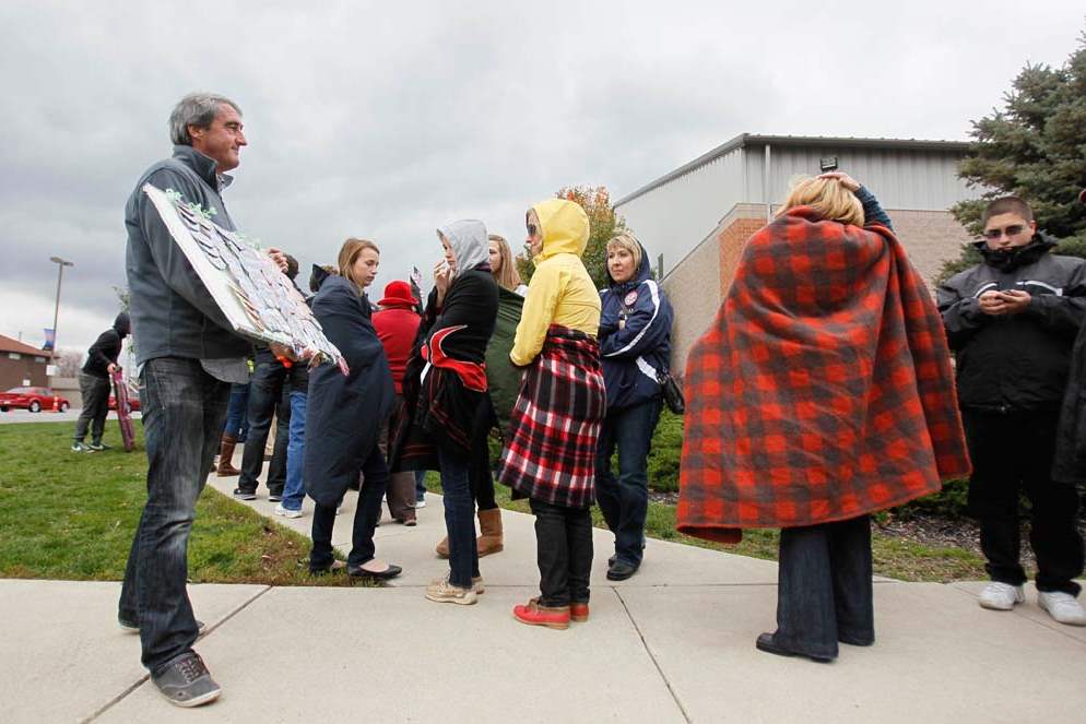 Paul Hatton, center, from Arlington, keeps warm while waiting with his friends outside of the University of Findlay Koehler Athletic Complex to see Mitt Romney and Paul Ryan during the 'Victory In Ohio' Bus Tour on October 28, 2012. Hatton said that he started the line at 9am.