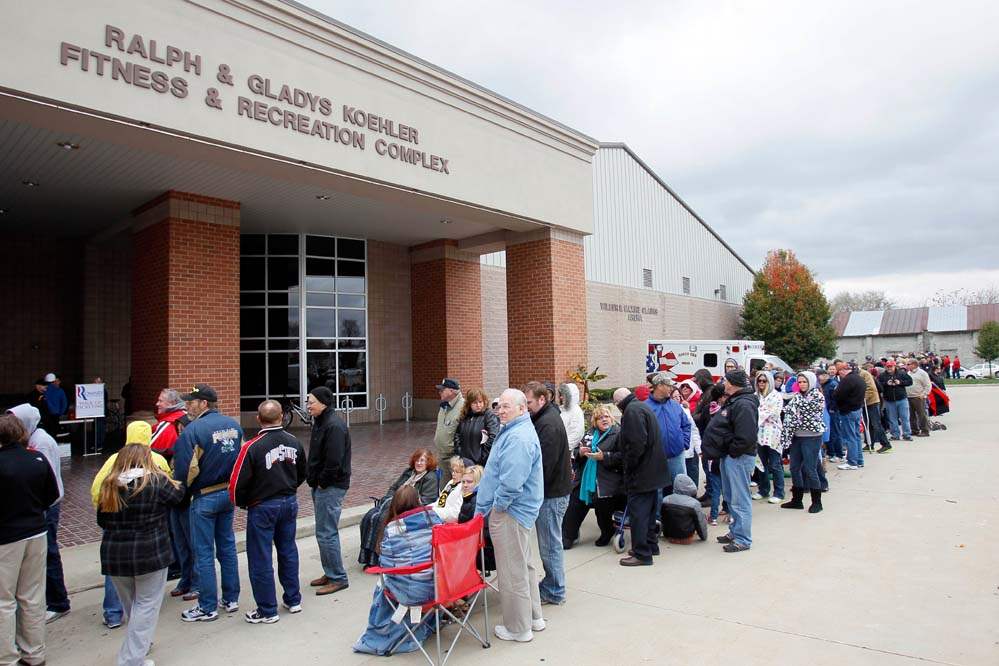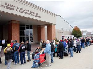 The crowd extends around the University of Findlay Koehler Athletic Complex while waiting to see Mitt Romney and Paul Ryan during the 'Victory In Ohio' Bus Tour on October 28, 2012.