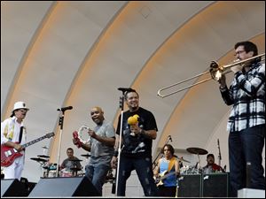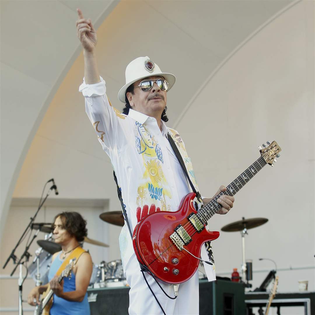 Carlos Santana gestures toward the crowd during a set at the Toledo Zoo.