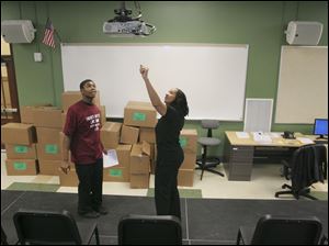 Scott High School junior Anthony Walker looks over the smart board projector in the choir room.