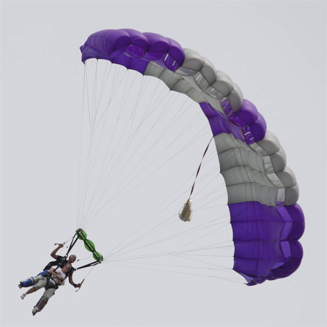 Robin Mower of Toledo and tandem instructor Dan Pushies return to earth at Skydive Tecumseh in Tecumseh, Michigan.