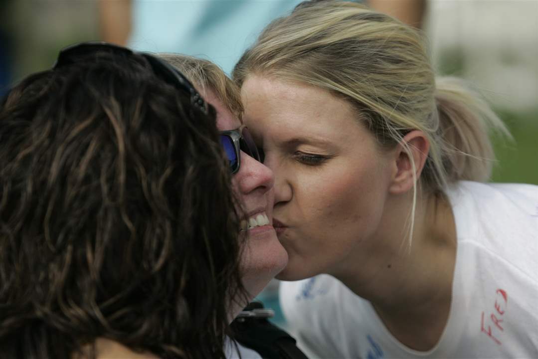 Lee Guardiola, left, and Brittany Frahn, right, congratulate Robin after her skydive. Both girls are Ms. Mower's daughters.