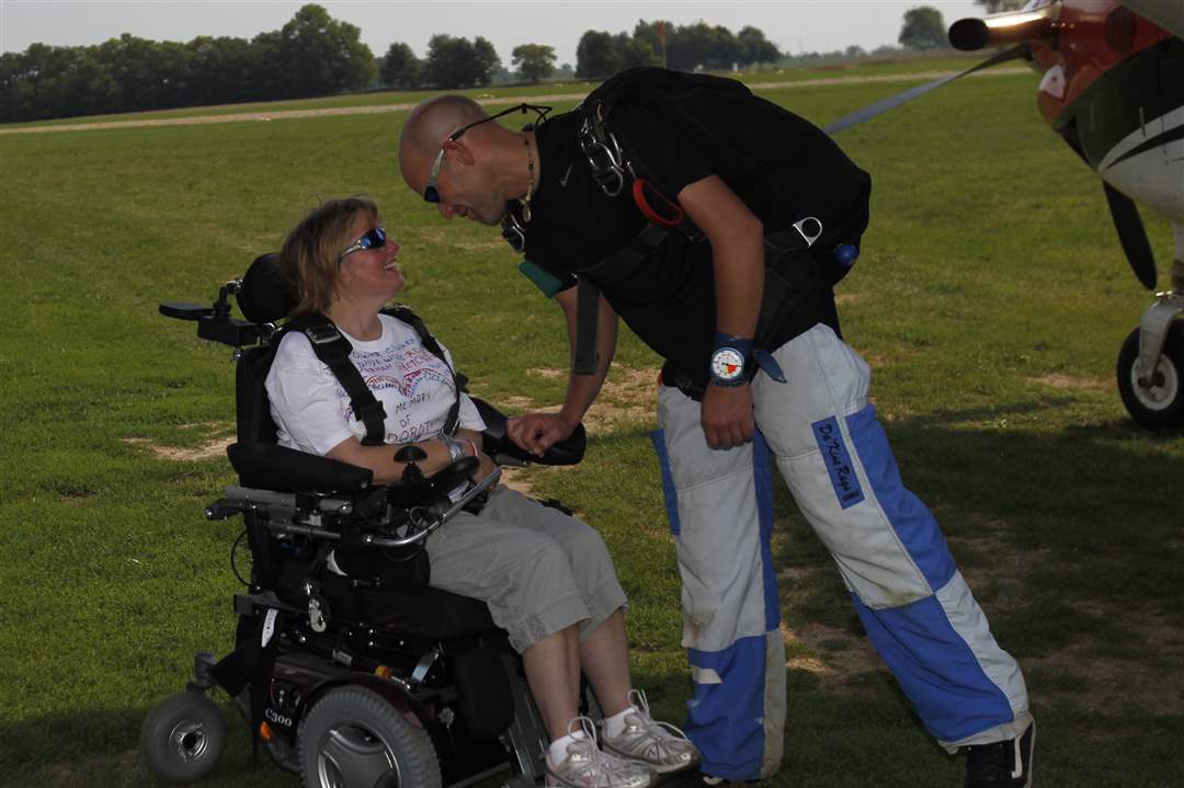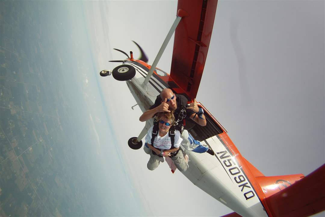 Toledoan Robin Mower, who has Lou Gehrig's disease, and her instructor, Dan Pushies of Skydive Tecumseh, get ready to leave the plane and complete the skydive.