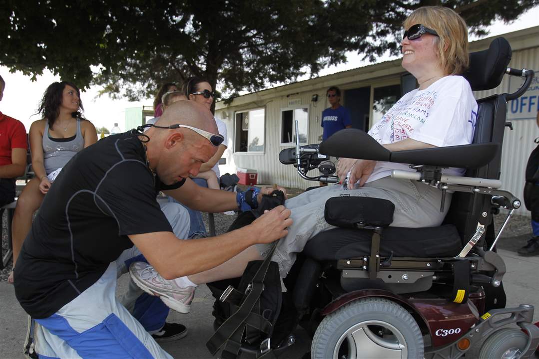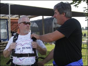 Jeff Meyer, cousin-in-law of Robin Mower of Toledo, prepares to skydive with instructor Rich Mulcare at Skydive Tecumseh in Tecumseh, Michigan. About 40 supporters also skydived as a fundraiser for ALS research.