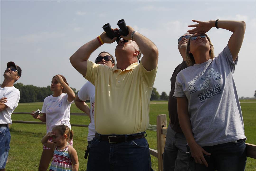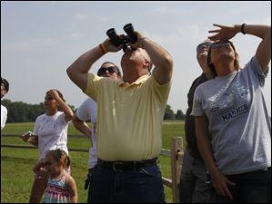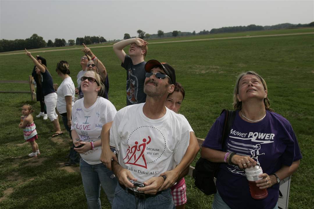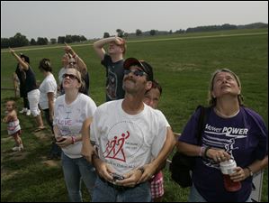 Friends and family of Robin Mower of Toledo have their eyes glued on the sky during her skydive.
