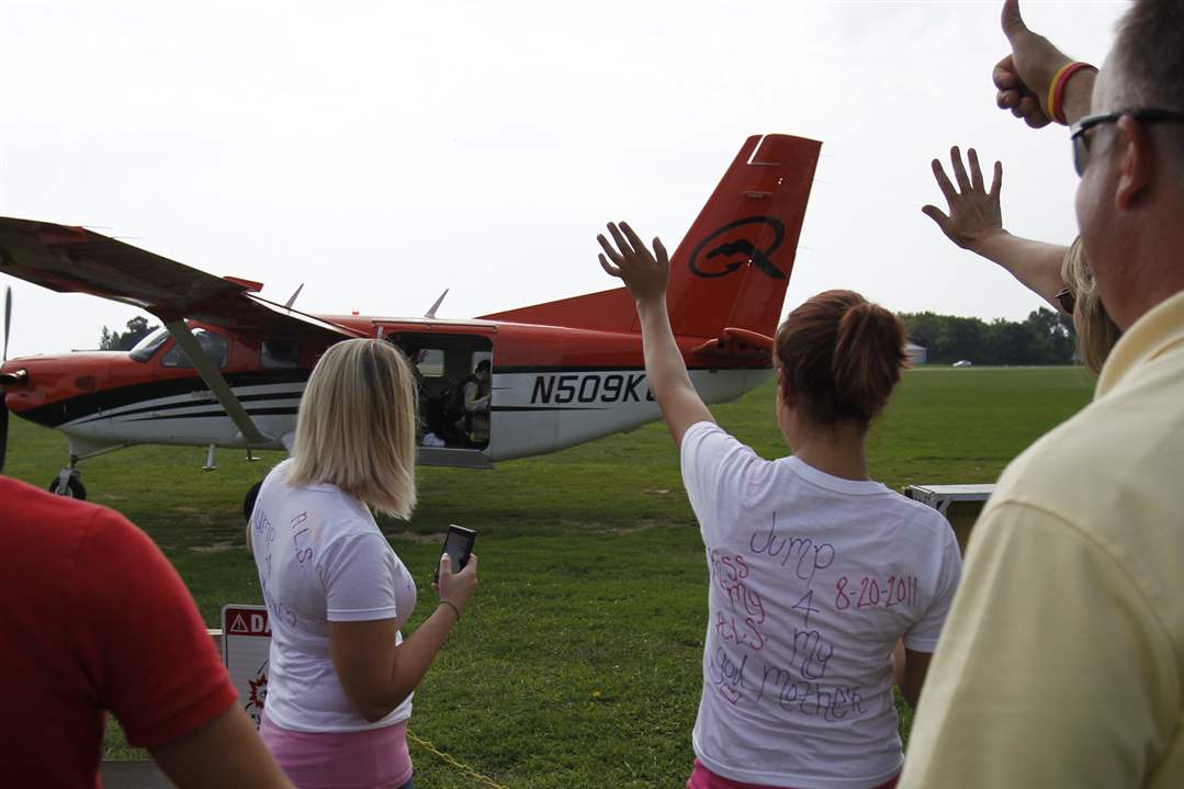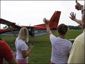 Family members at Skydive Tecumseh in Tecumseh, Mich., wave to Robin Mower of Toledo as she takes off in the plane to skydive.