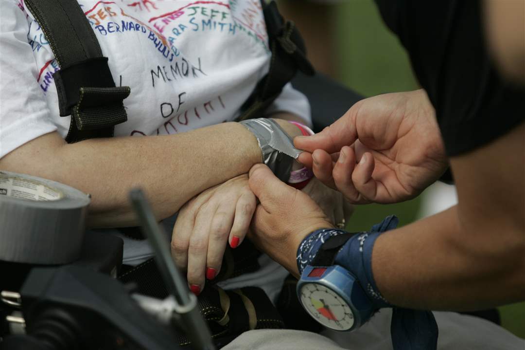 Robin Mower's hands are secured with Duck tape by instructor Dan Pushies as they prepare for a skydiving decent at Skydive Tecumseh in Tecumseh, Mich.