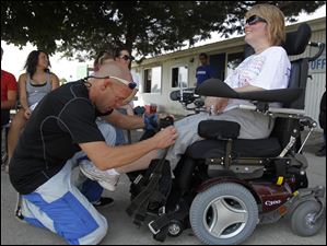 Robin Mower Is surrounded by a skydiving crew as they release her from the parachute after skydiving withDan Pushies, second from left, at Skydive Tecumseh in Tecumseh, Mich.