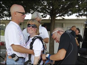 John Mower holds up his wife, Robin Mower of Toledo, as she prepares for a skydiving decent with instructor Dan Pushies.