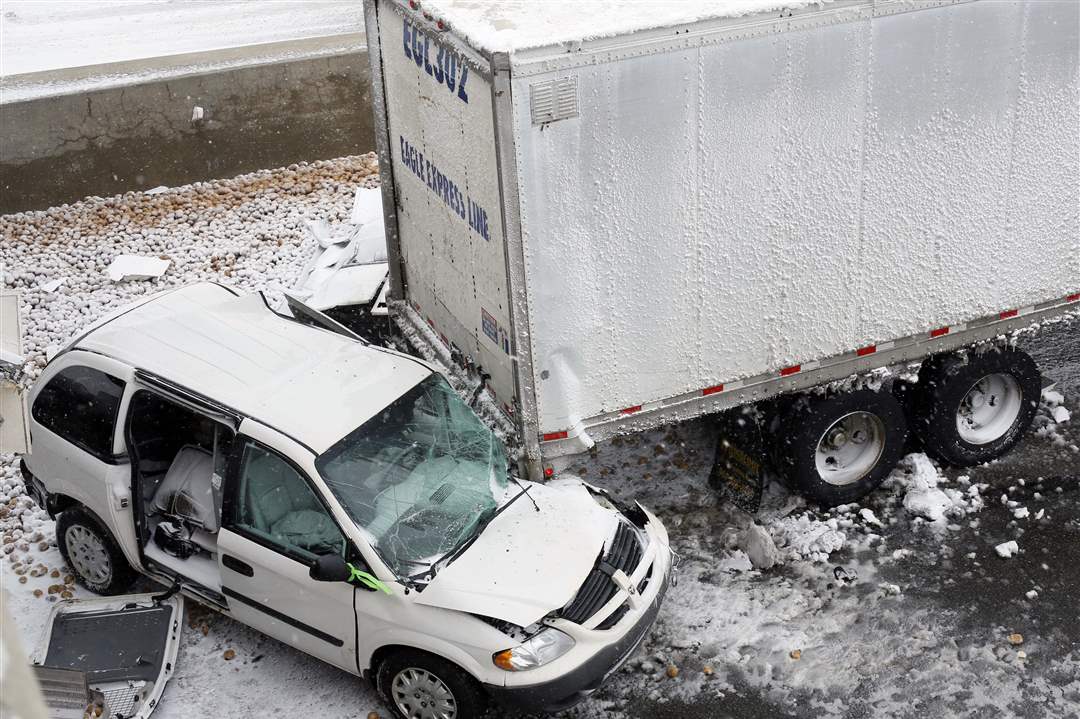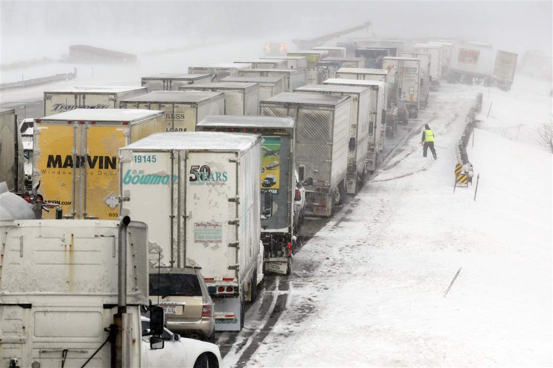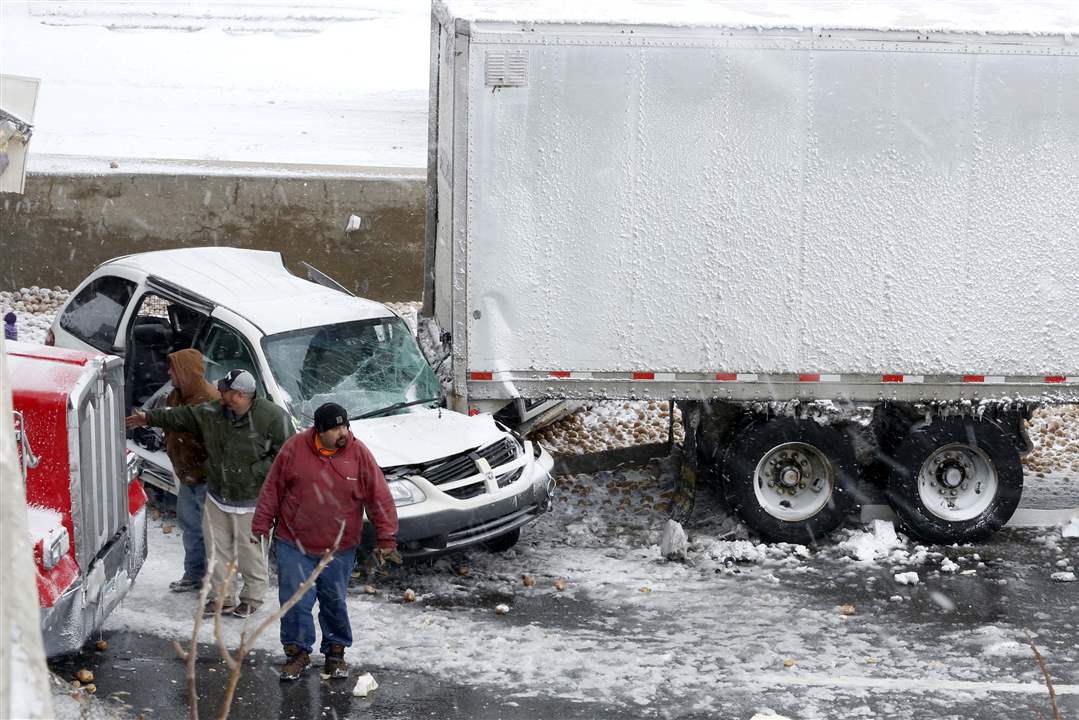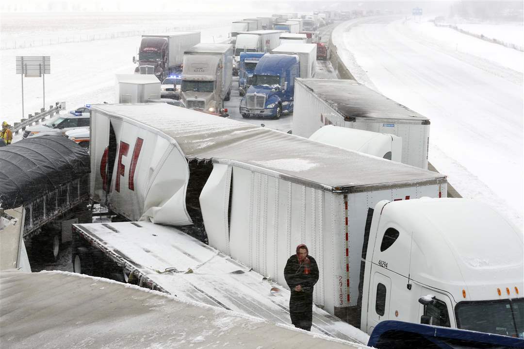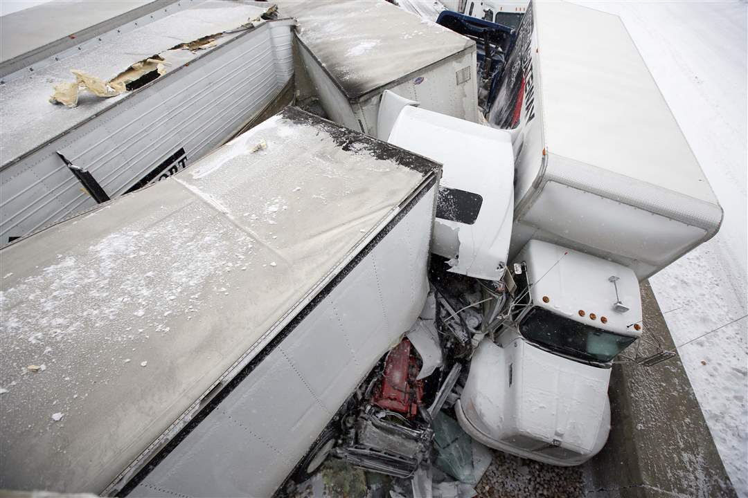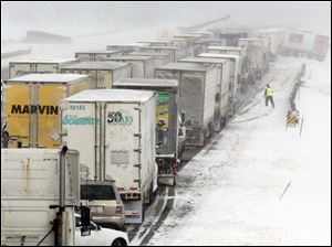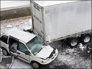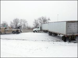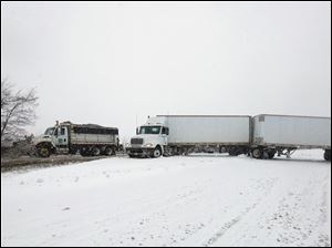 A snow plow passes a jackknifed tuck on southbound I-75 near the I-280 split in Toledo.
