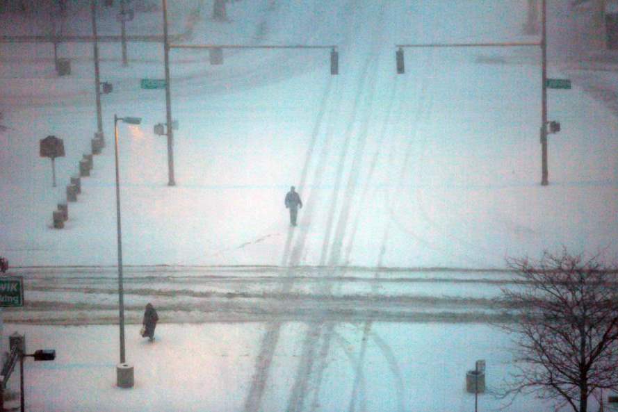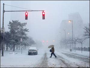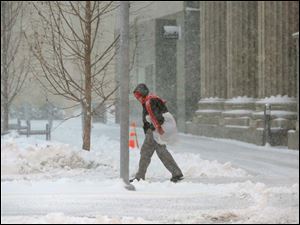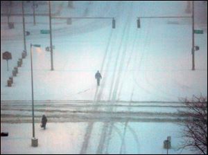 A pedestrian crosses Jackson Street during northwest Ohio's most recent snowstorm.