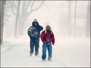 Two unidentified boys take advantage of snow day from school by playing near Dorr Street during a level 3 snow emergency.