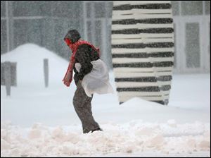 Rita Wheeler battles the snow and wind to make here way to work in downtown Toledo.