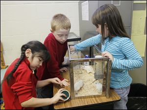 Natalie Segovia, from left, Kyle Johnson, and Gabrielle Grove care for their kindergarten class' gerbils