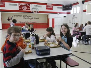 Second-graders Mason Hablitzel, left, and Nikki Juergens eat lunch in the cafeteria/gym.