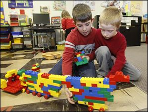 Kindergartners Graecen O' Rourke, left, and Kyle Johnson build a very big truck during indoor recess at Solomon Lutheran School, an ELCA grade school in Woodviile, Ohio.