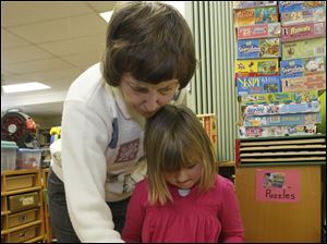Kindergarten teacher Kay Nickelsen, left, helps Alana Knepper with a puzzle.
