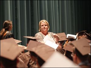 Dean of students and senior class advisor Mandy Ballantyne instructs the student before the ceremony.