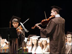 Seniors and soloists Sam Chang, left, and John Burchfield, III perform the presto movement from Mozart's "Violin and Viola Concerto", accompanied by the Southview Orchestra.