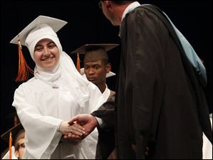 Yusra Issam Mansour, left, is congratulated by principal David McMurray.