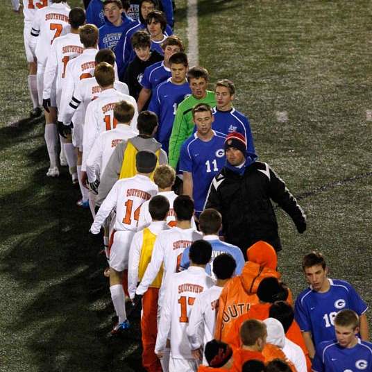 Southview and Anthony Wayne players shake hands after the D-I soccer regional semifinal at Central Catholic.