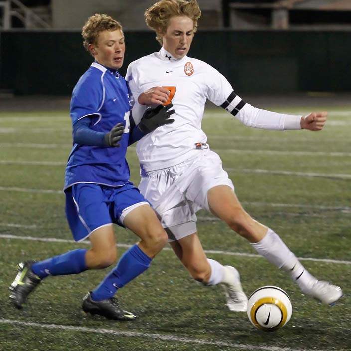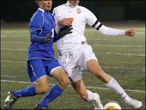 Anthony Wayne's JJ Fortner, left, and Southview's Brad Brown chase the ball during the D-I soccer regional semifinal at Central Catholic.