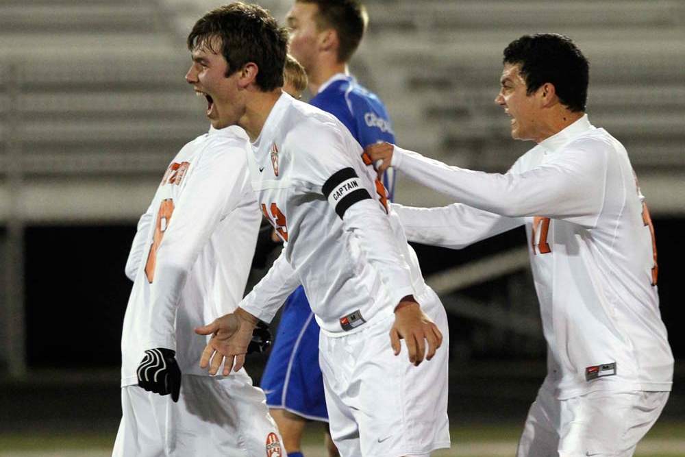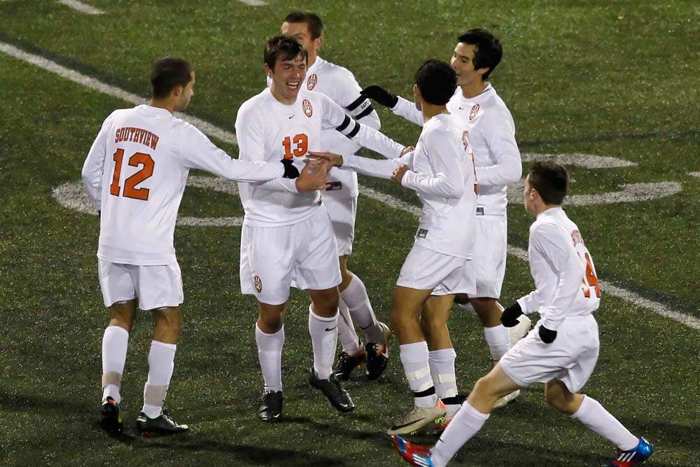 Southview teammates surround Jared Lyle (13) who scored both goals against Anthony Wayne.