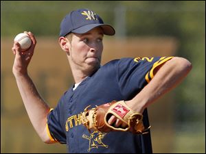 Whitmer pitcher Blake Melchert (34) throws to first base.