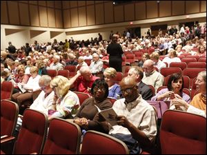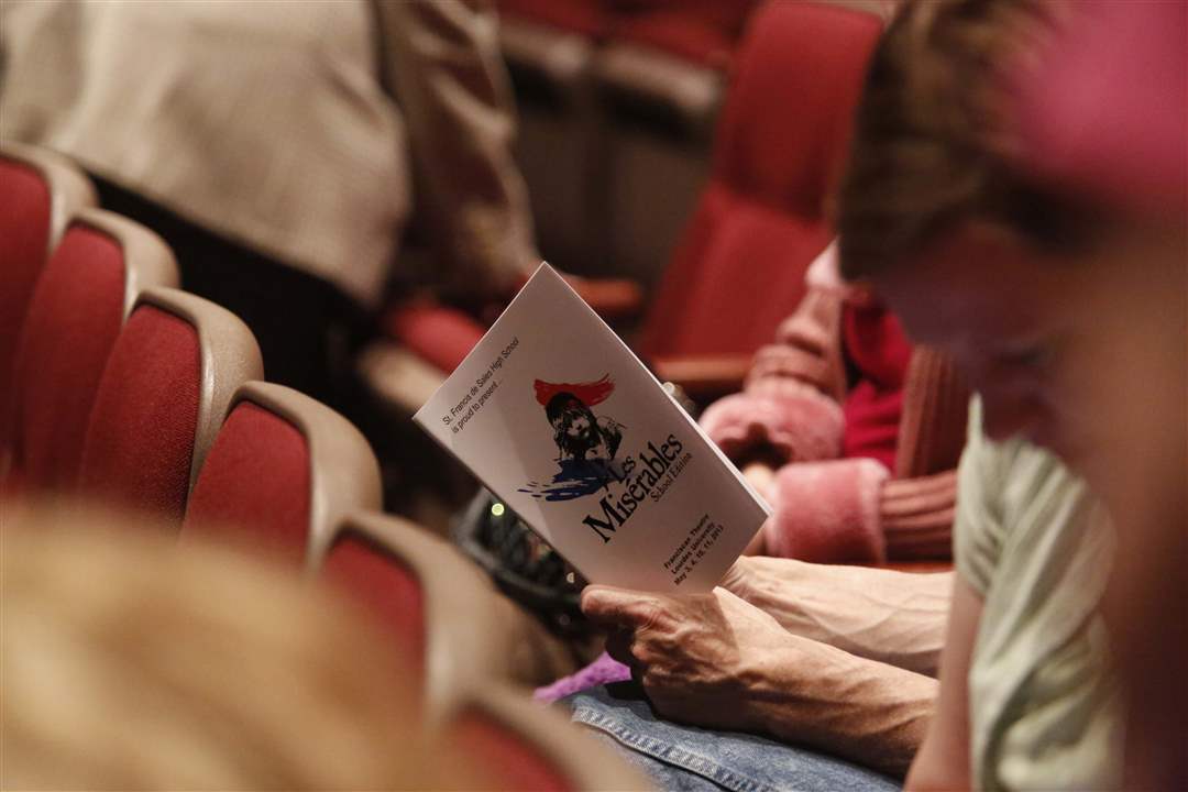 Rita, center, and John Hairston, of Cleveland, right, took a look at their program before the beginning of Act I. The Haristons' grandnephew, Robert Pamies, played the role of Javert.