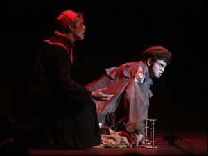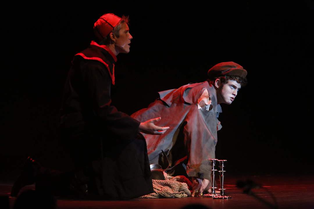 Playing the Bishop, Eli Spang, left, and Derek Kaster, playing Jean Valjean, right, sing together during Act I.