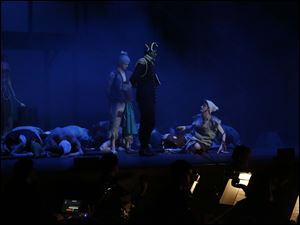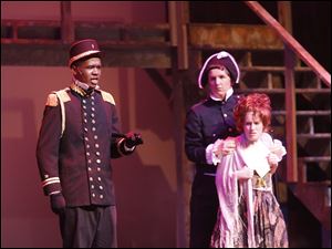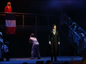 Robert Pamies, playing Javert, center, and Derek Kaster, playing Jean Valjean, right, are joined on stage by other actors during the opening scene.