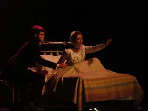 Derek Kaster, playing Jean Valjean, left, and April Varner, playing Fantine, right, sing together during Act I.