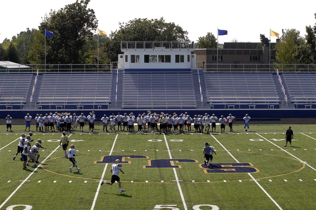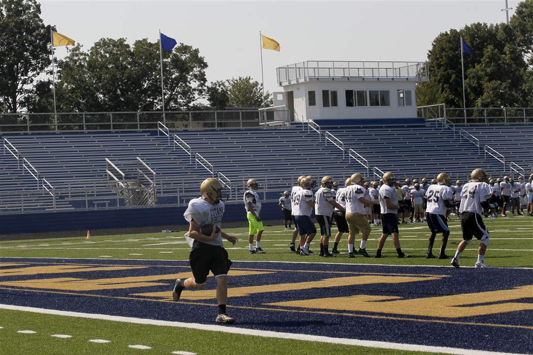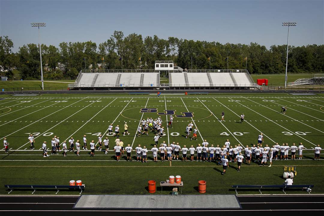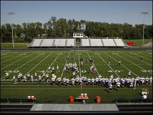 The football team practices on Lyden Field at Toledo's St. John's Jesuit High School & Academy. The school is debuting the new field after more than a year of construction. The $2.3 million project was completed in early 2012 and is being dedicated at 6:35 p.m. on August 31, 2012 before the first home game.