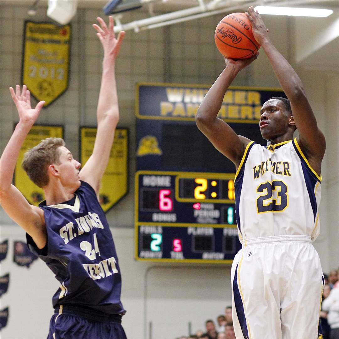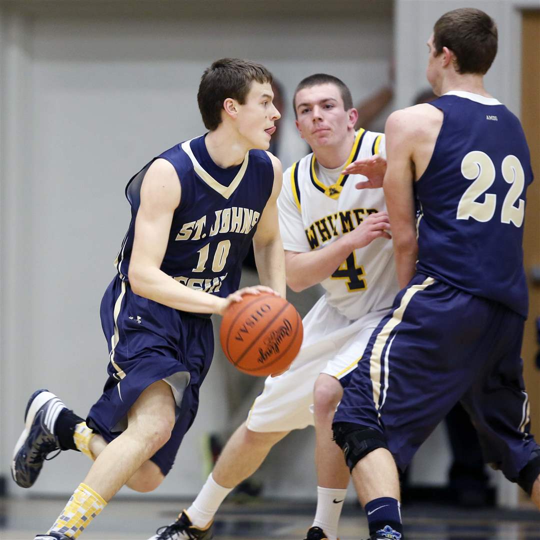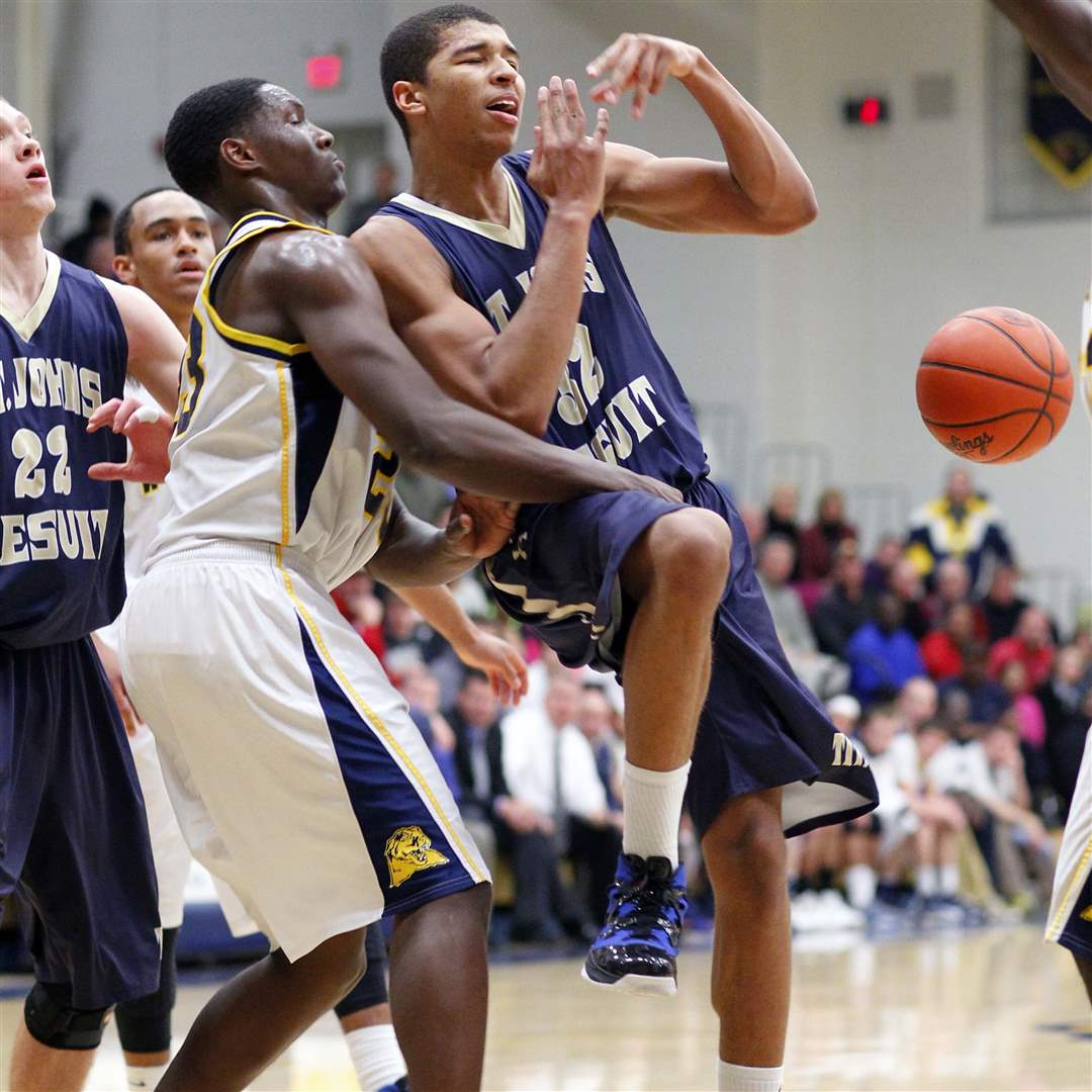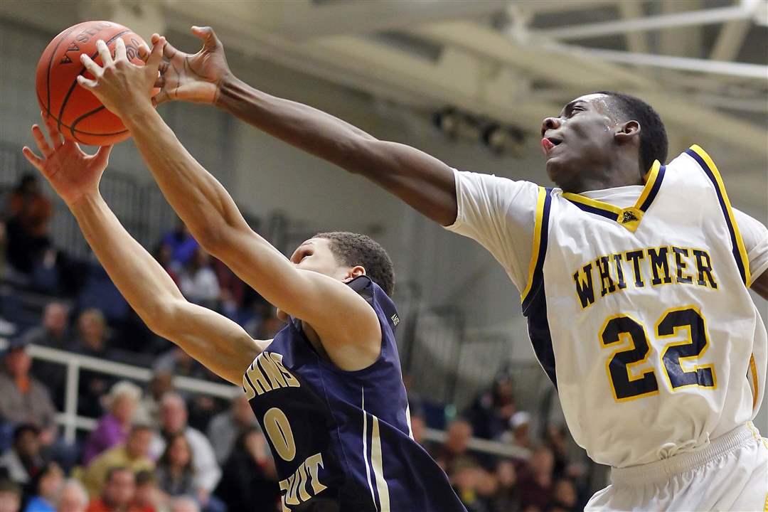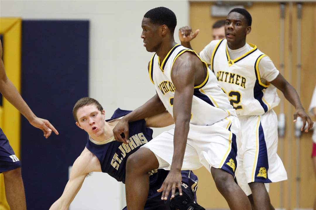 Whitmer's Nigel Hayes (23) defends against St. John's Jesuit's Marc Loving (32).